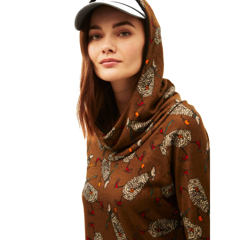 Blouse with long sleeves and hood in brown color with happy sheep print