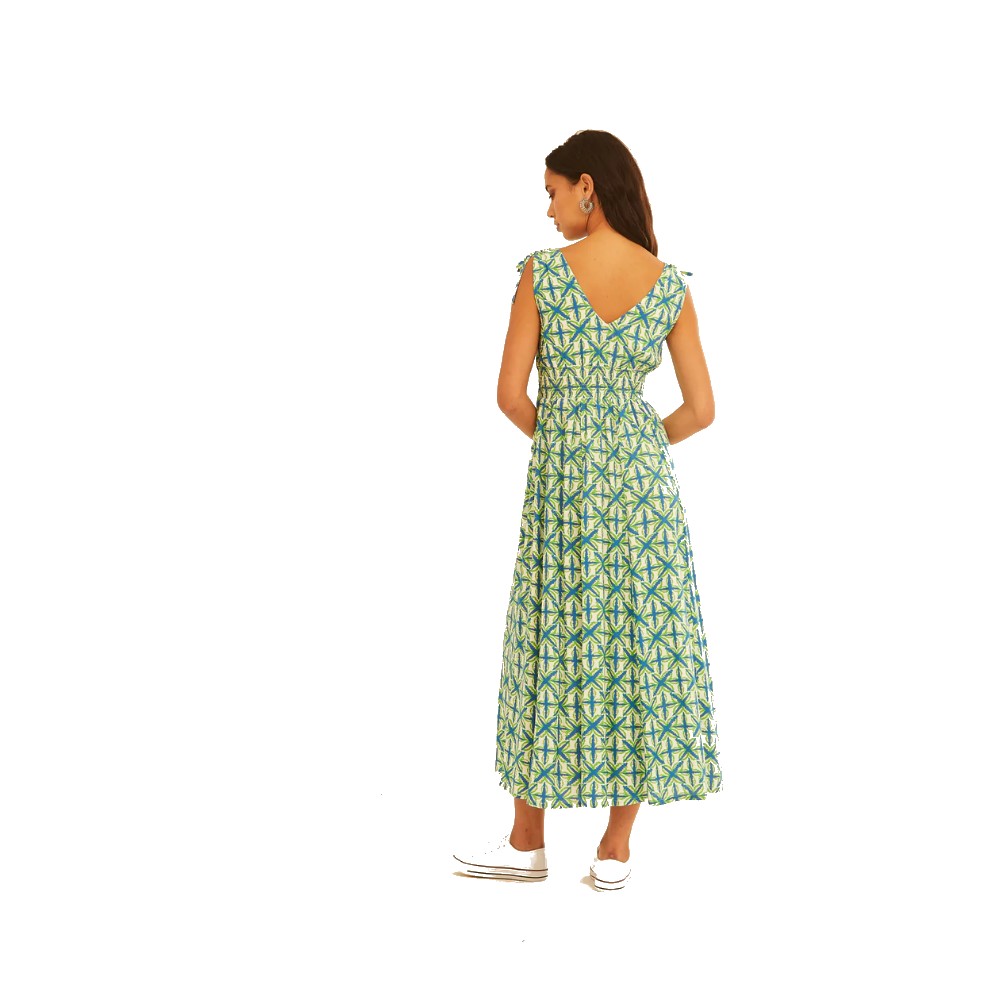 Long summer dress with V-shaped neckline, elastic waist and fringed detail on the shoulders for easy adjustment.