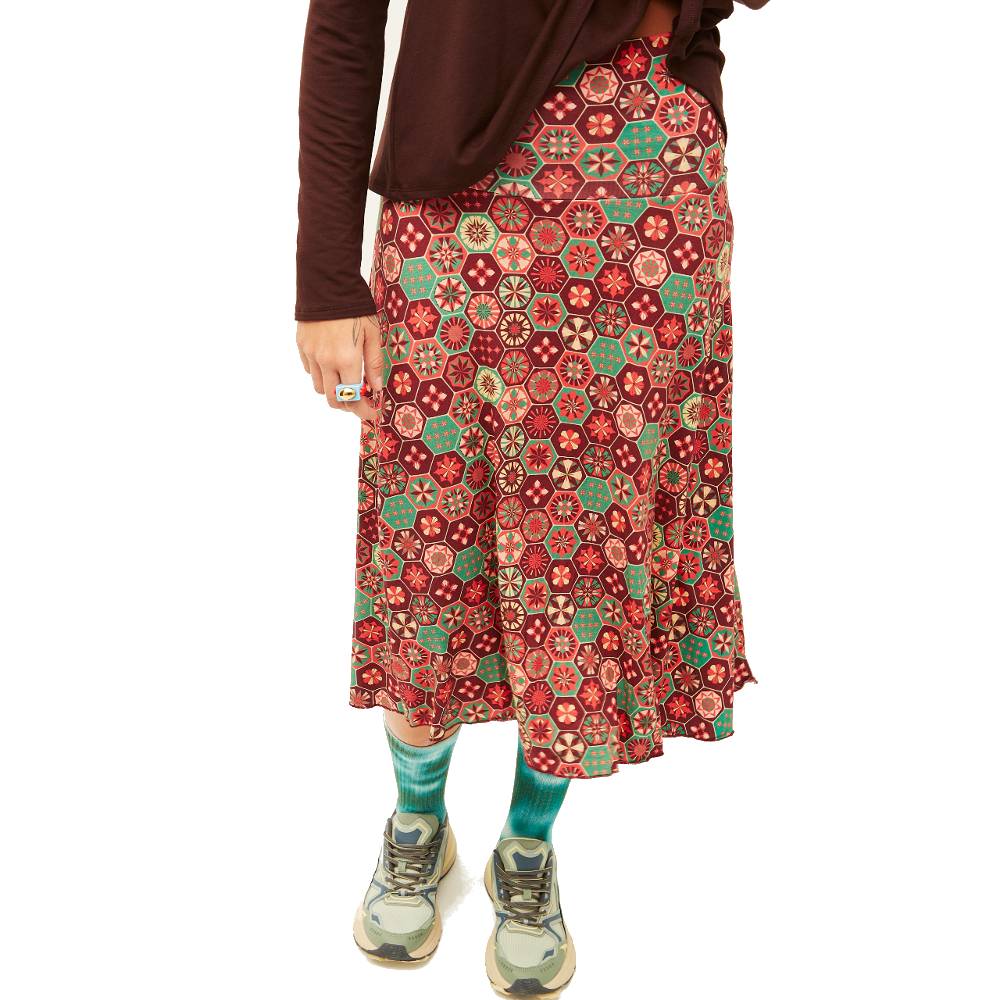 Midi skirt pink retro mosaic print. Midi skirt with elastic waist in lovely pink color and retro mosaic print. A comfortable choice for a modern look with retro touches! Composition. 5% elastane.
