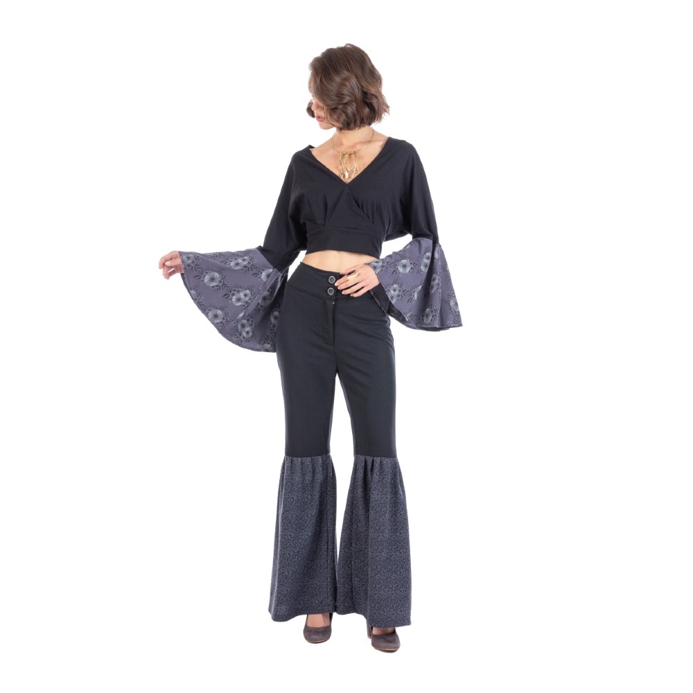 Women’s casual long sleeve winter blouse in black color cropped top. The sleeve has a bell with ruffles and printed flowers. Worn at all hours for a special boho look.