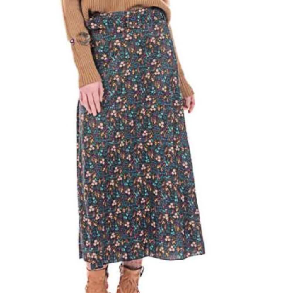 Platinum winter maxi skirt in alpha line teal with patterns of small colorful flowers