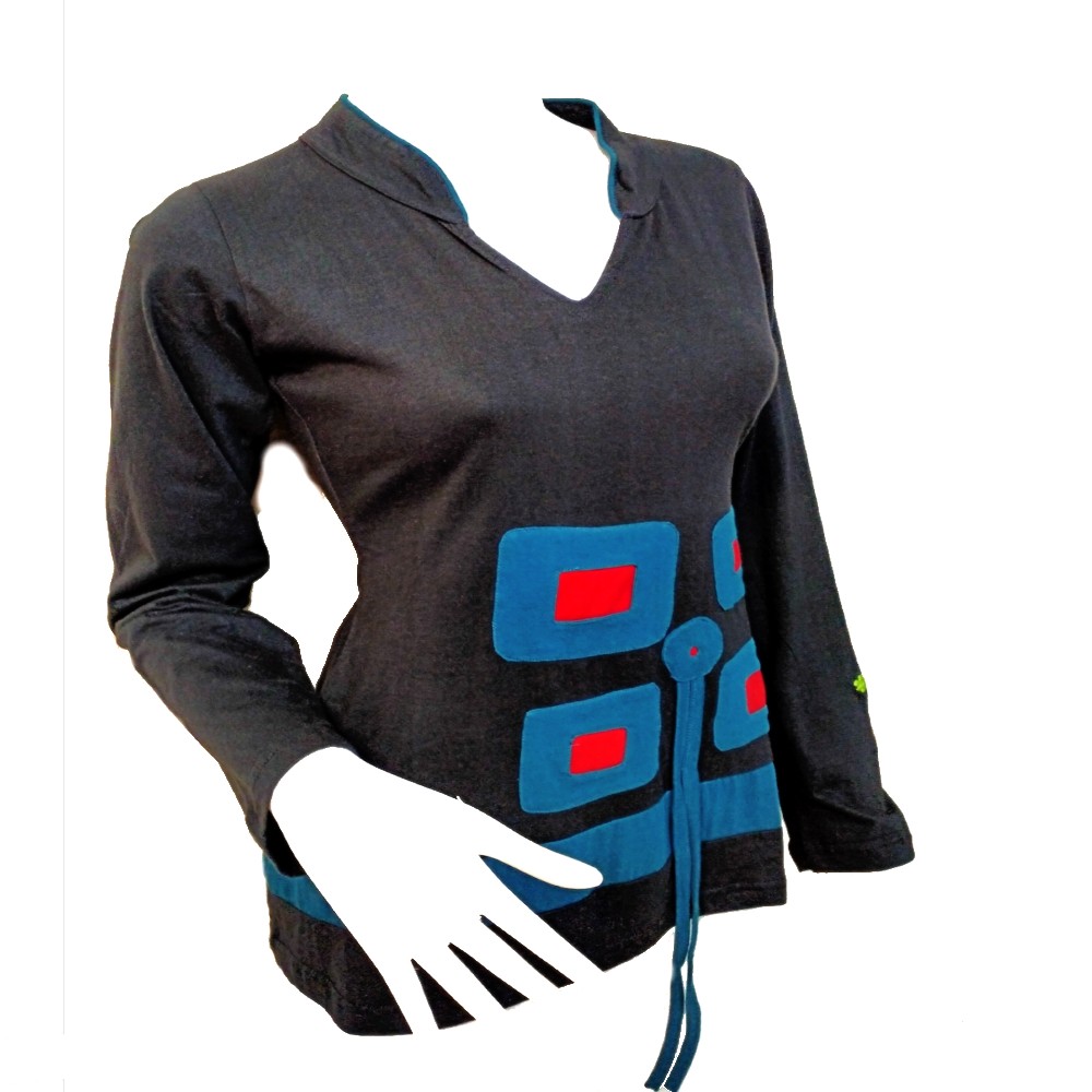 Women’s blouse in black color with rectangular designs in blue and red stitching with patchwork technique and in V neckline.