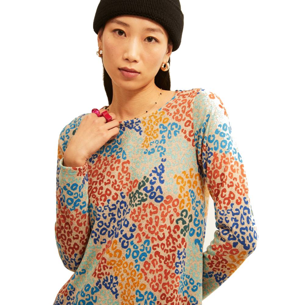 Φόρεμα κοντό με λαιμόκοψη χαμόγελο σε λευκό χρώμα και χρωματιστό λεοπάρ.
