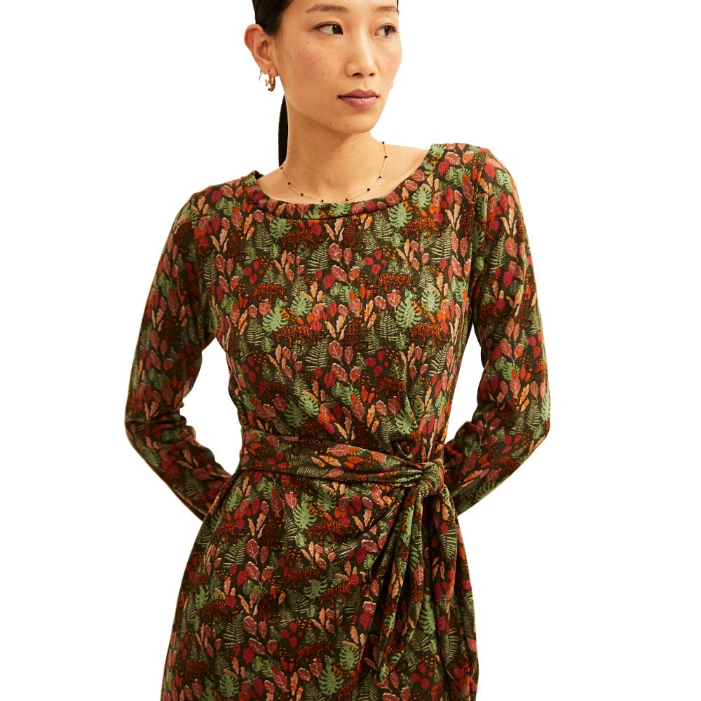 Φόρεμα κοντό σε πράσινο χρώμα με σούρα χαμηλά στην μέση και ζώνη από το ίδιο ύφασμα με τύπωμα τοπίο στην ζούγκλα.
