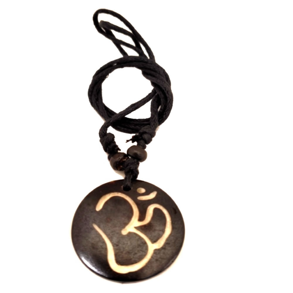 Μενταγιόν -κολιέ κοκκάλινο σε μαύρο και λευκό χρώμα με το σύμβολο του Ομ, με κορδόνι δερμάτινο που προσαρμόζεται στοστο ύψος που επιθυμείτε. Χειροποίητο σκαλιστό από Νεπάλ.