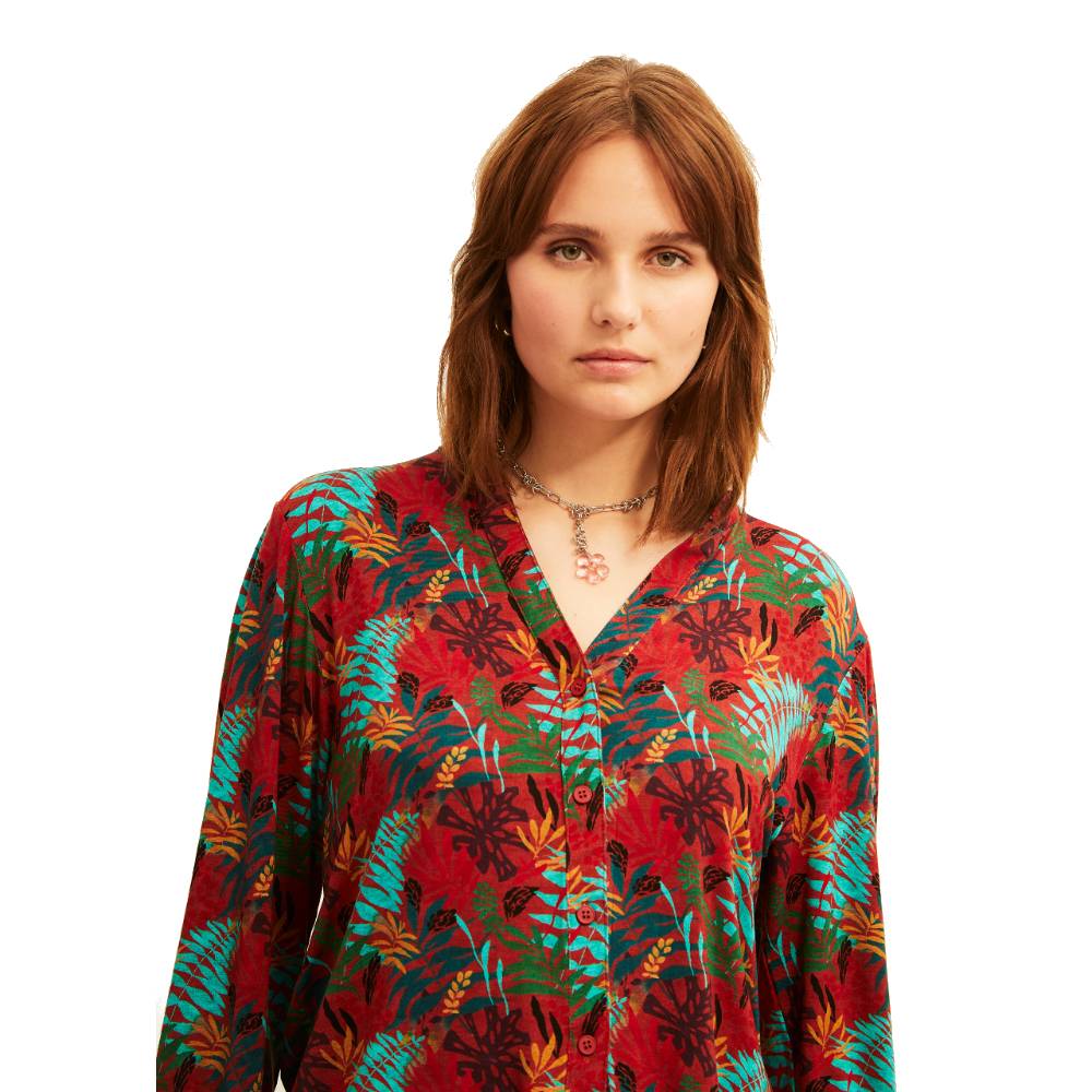 Πουκάμισο με μακρύ μανίκι και λάστιχο μανσέτα και ανοιχτό γιακά σε μπορντό χρώμα και σχέδιο τροπικά φύλλα.